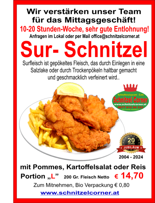 Wir verstärken unser Team für das Mittagsgeschäft! 10-20 Stunden-Woche, sehr gute Entlohnung, anfragen im Lokal oder Mail: office@schnitzelcorner.at